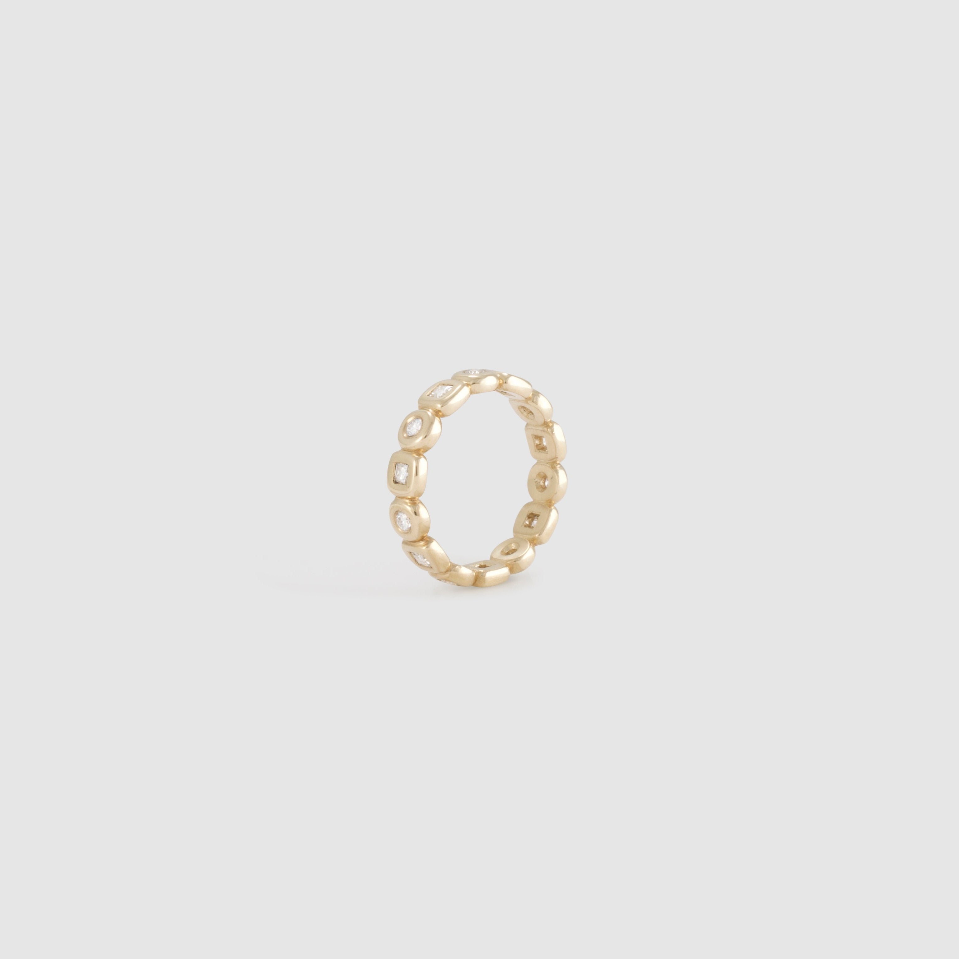 The Cloud Pillow Bezel Eternity Band is a delicate yet striking piece, featuring cushion-cut diamonds encased in puffy bezel settings. This eternity band exudes elegance and grace, with each diamond set to highlight its natural brilliance while offering a secure, modern look. Perfect for those who appreciate understated luxury, the Cloud band is a timeless symbol of infinite love and commitment, making it an ideal engagement or anniversary ring.