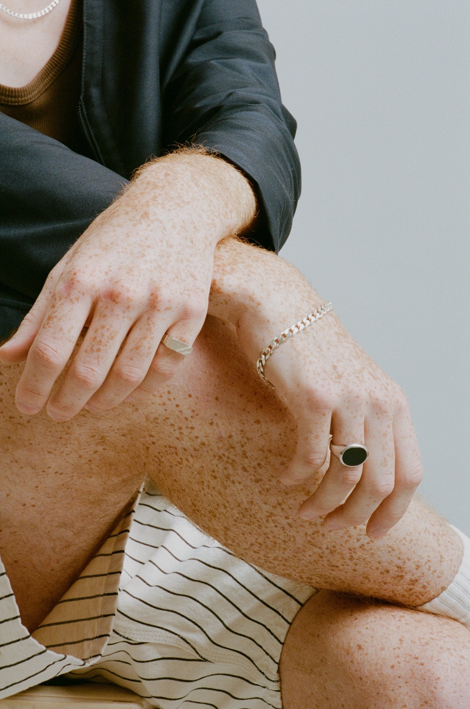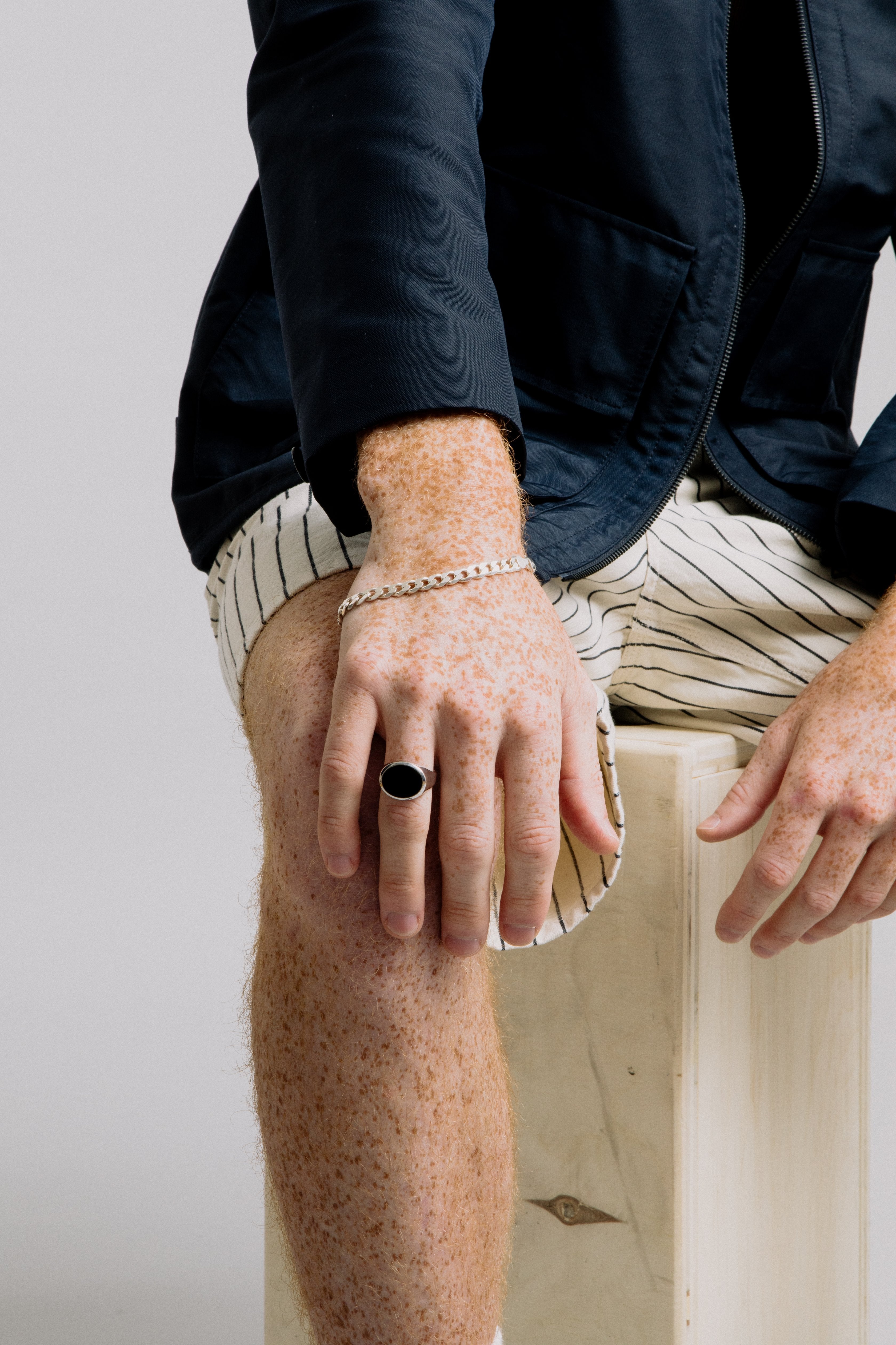 Model is wearing 9" Thick Curb Chain Bracelet with Oval Onyx Ring